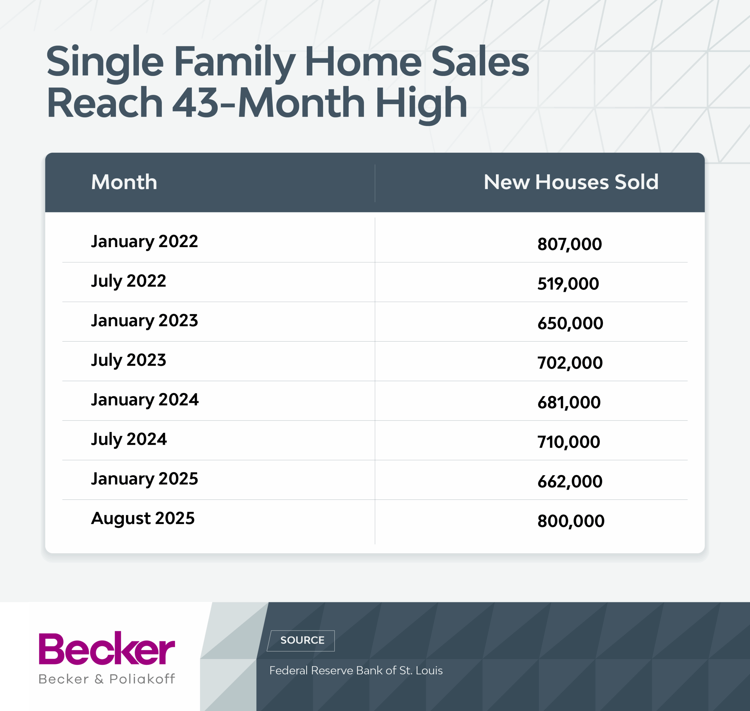 After a prolonged period of sluggish activity, buyers are finally beginning to reenter the market. Americans bought 800,000 new single-family homes in August 2025 – up 15.4% from a year earlier and the highest level since January 2022, federal data shows. That marks a 43-month high.