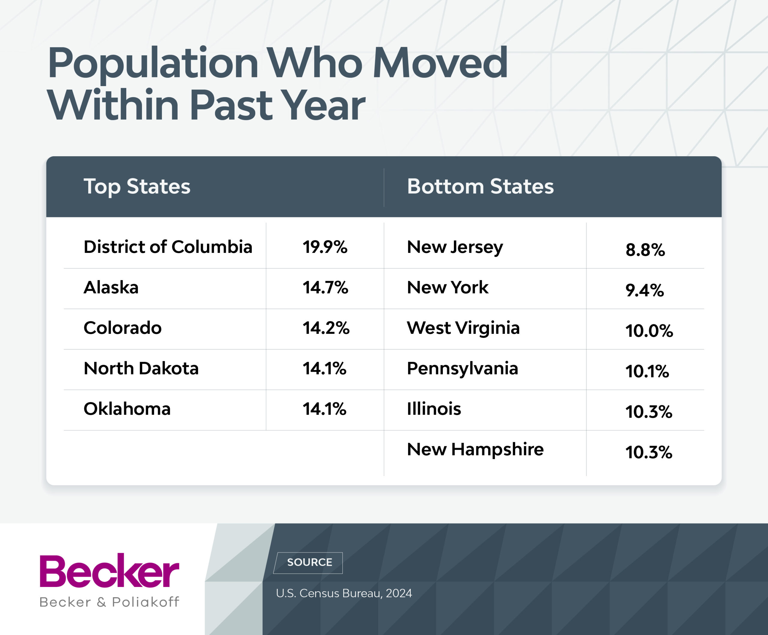 - Population who moved within the past year, either from within the state, out of state or abroad (U.S. Census Bureau, 2024)