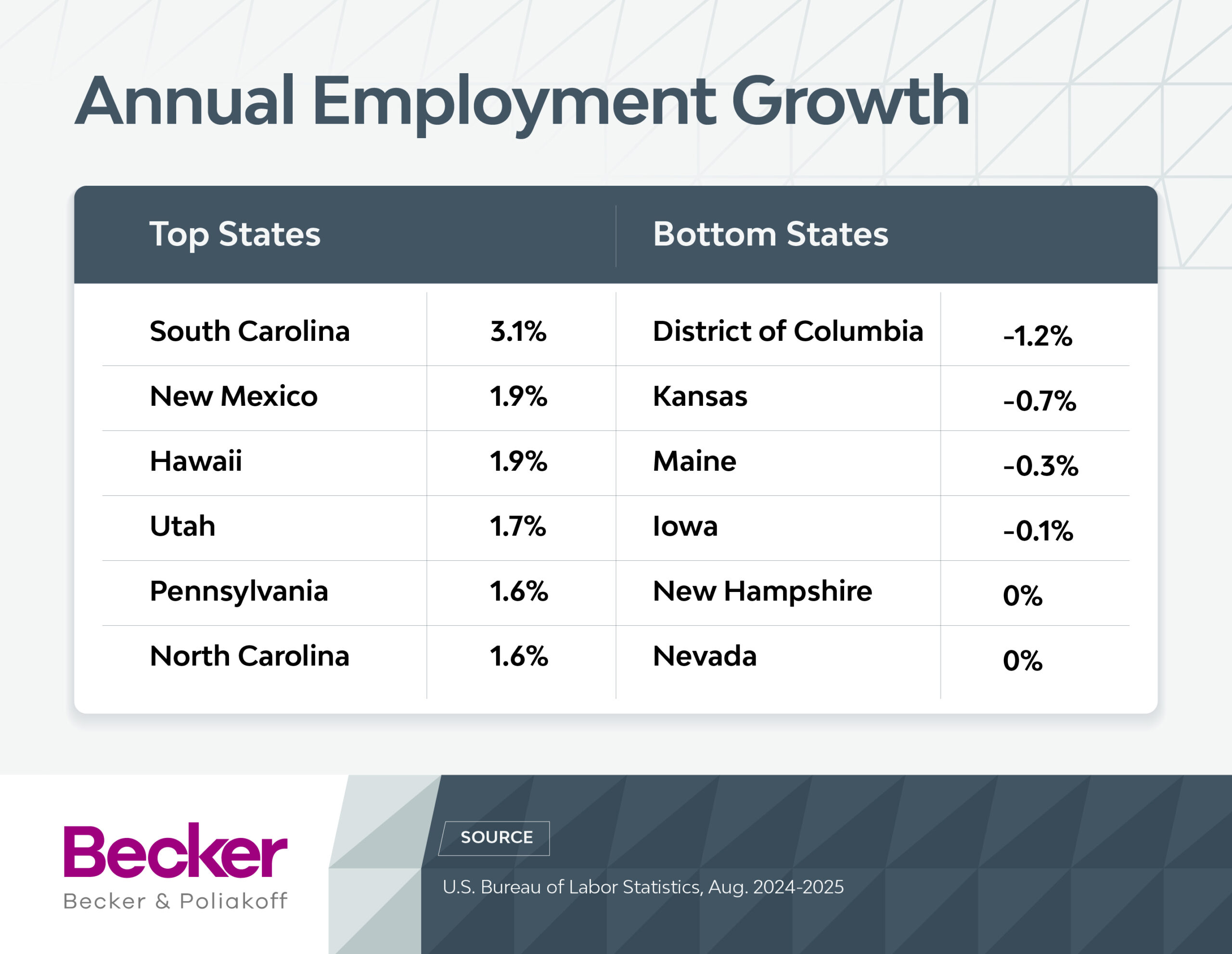 - Year-over-year employment growth (U.S. Bureau of Labor Statistics, Aug. 2024-2025)