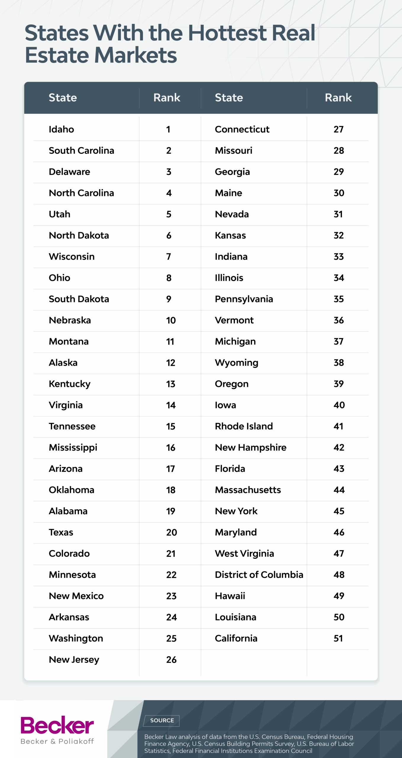 To help Americans understand the current landscape, Becker & Poliakoff released a study, “States With the Hottest and Coldest Real Estate Markets in 2026,” based on an analysis of eight key metrics from federal data across all 50 states and D.C. The study also identifies the hottest metro area in each state.