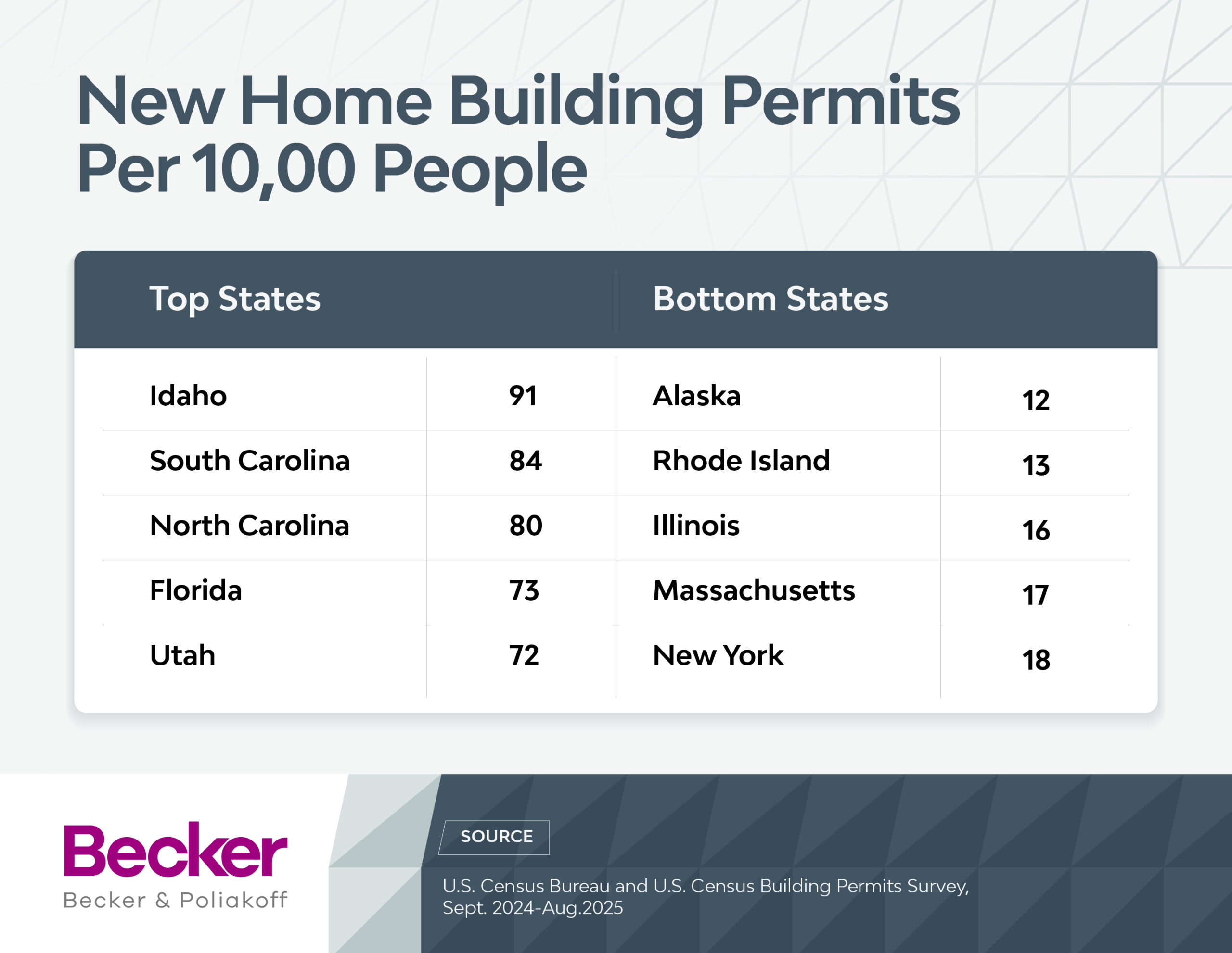 - Building permits per 10,000 residents for new privately owned housing units (U.S. Census Bureau and U.S. Census Building Permits Survey, Sept. 2024-Aug.2025)