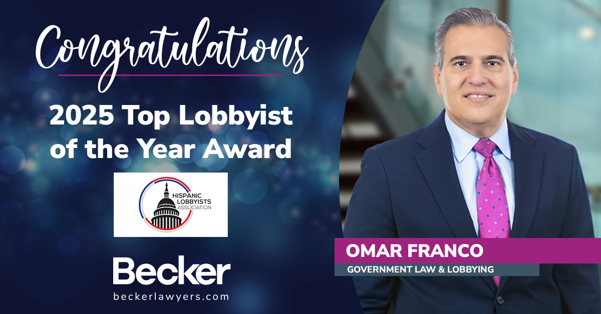 Washington, D.C. – September 29, 2025 – Becker is proud to announce that Omar Franco, Senior Director and head of the firm’s Federal Lobbying Practice in Washington, D.C., has been honored with the 2025 Top Lobbyist of the Year Award by the Hispanic Lobbyists Association (HLA). Presented as part of […]