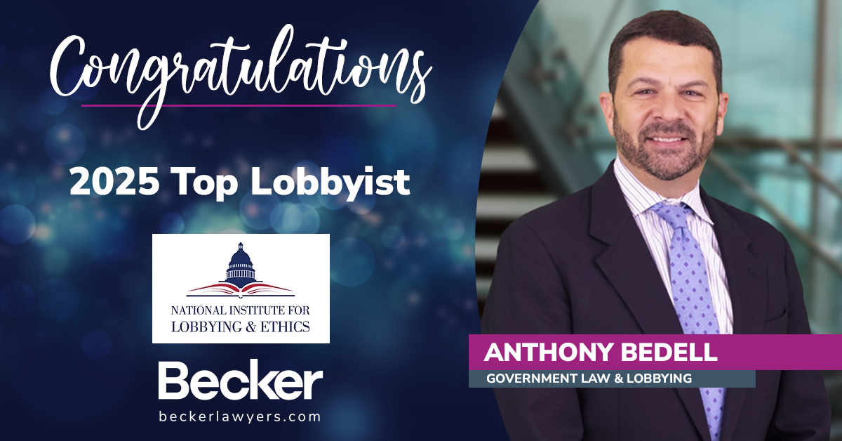October 23, 2025 – Washington, D.C.— Becker is pleased to announce that Anthony Bedell has been recognized as a Top 2025 Lobbyist by the National Institute for Lobbying and Ethics (NILE). This prestigious honor is awarded to industry professionals who have achieved notable legislative successes, demonstrated innovation, earned the respect […]